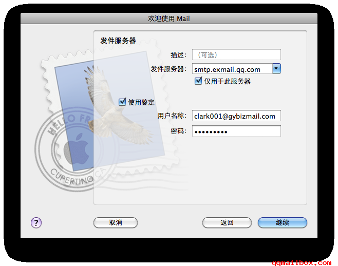 1.在Mac打开Mail,进入新增帐户页面,输入您的企业邮箱地址和密码,点击“继续”。