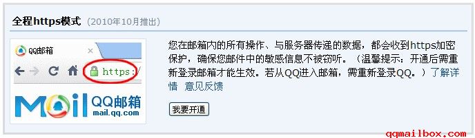 提示:1)开通后需要重新登录邮箱才能生效。2)若您从QQ进入邮箱,需要重新登录QQ。支持QQ2009中文正式版及以后版本。 你可以在浏览器的地址栏,看到地址的前缀是https://,表明当前页面正在使用https安全连接。