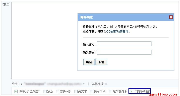 写信页面,展开[其他选项]可见“对邮件加密”,设置密码时需要您输入两次以确保密码无误。