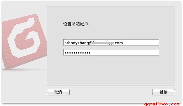 在弹出的对话框中填入完整的电子邮件地址和密码后,按住键盘上的“command”键不放,点击“继续”按钮,进入手动配置界面。