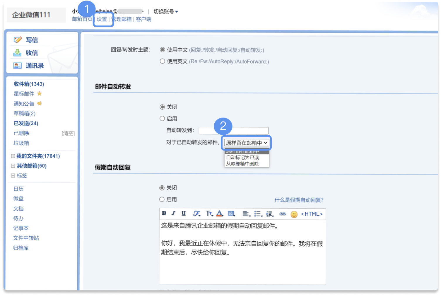 腾讯企业邮箱支持开启“自动转发”功能,可以通过设置,将腾讯企业邮箱收到的邮件转发到其他邮箱集中管理; 设置方法如下:网页版登录邮箱【邮箱设置->常规设置->自动转发】。