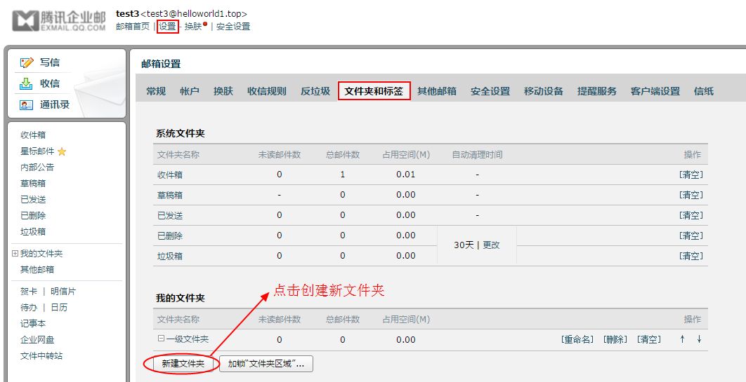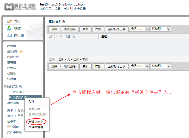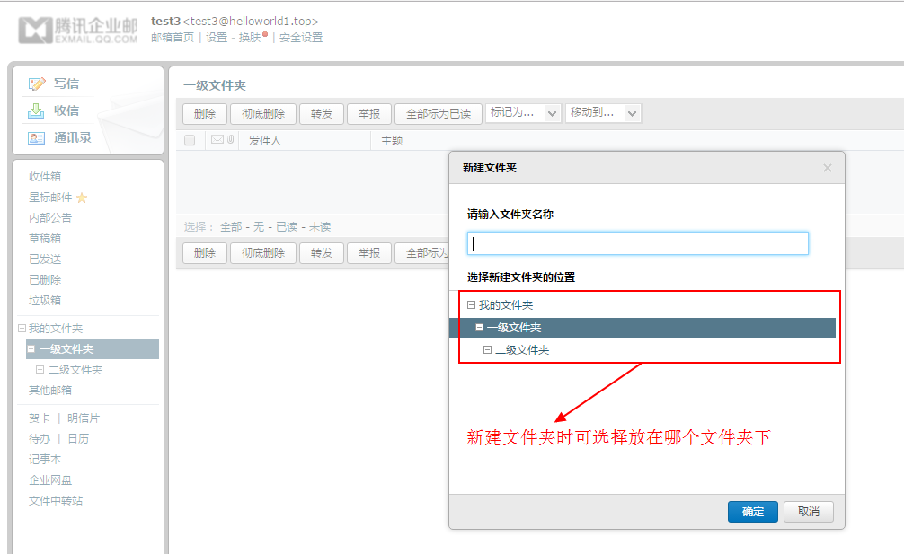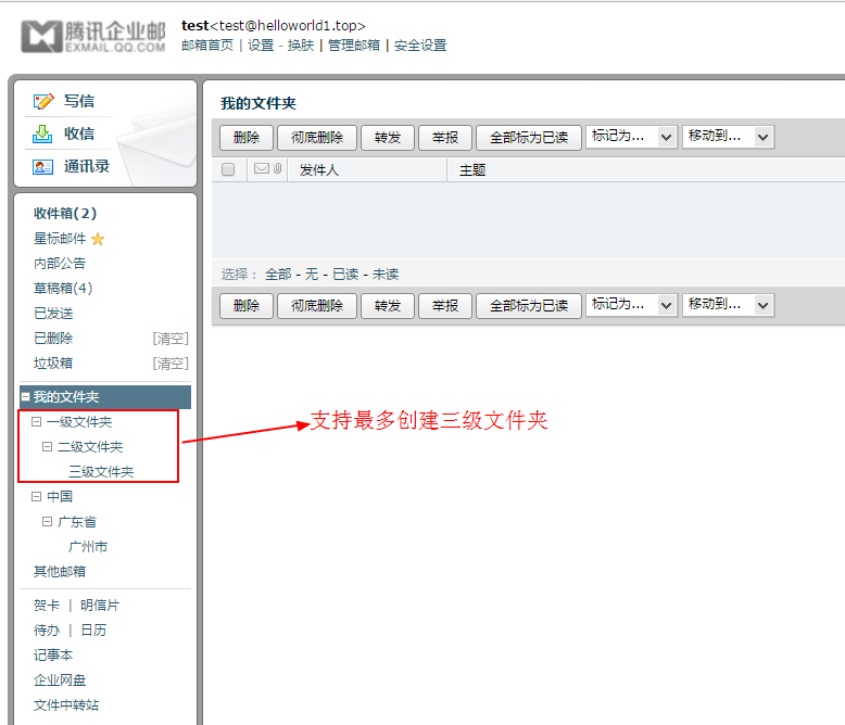腾讯企业邮箱网页版支持多级文件夹功能,支持最多创建三级文件夹,如下图: