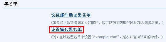 1,在“邮箱设置”->“反垃圾”->“黑名单”栏目中,点击“设置域名黑名单”。