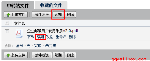 续期的方法是:进入企业邮箱文件中转站,对于已经上传完毕的文件,点击操作栏的“续期”,就可以将保存时间复原到最大。