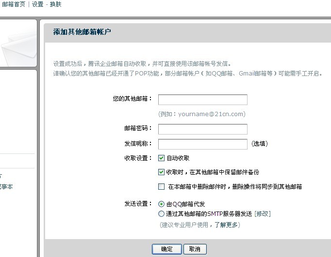 您只需要登陆WEB网页邮箱,打开“设置”-“其他邮箱”,点“添加其他邮箱账户”,打开如下图,输入您要设置的其他邮箱地址和密码,收取设置根据自身需求勾选,点击“确认”即可。